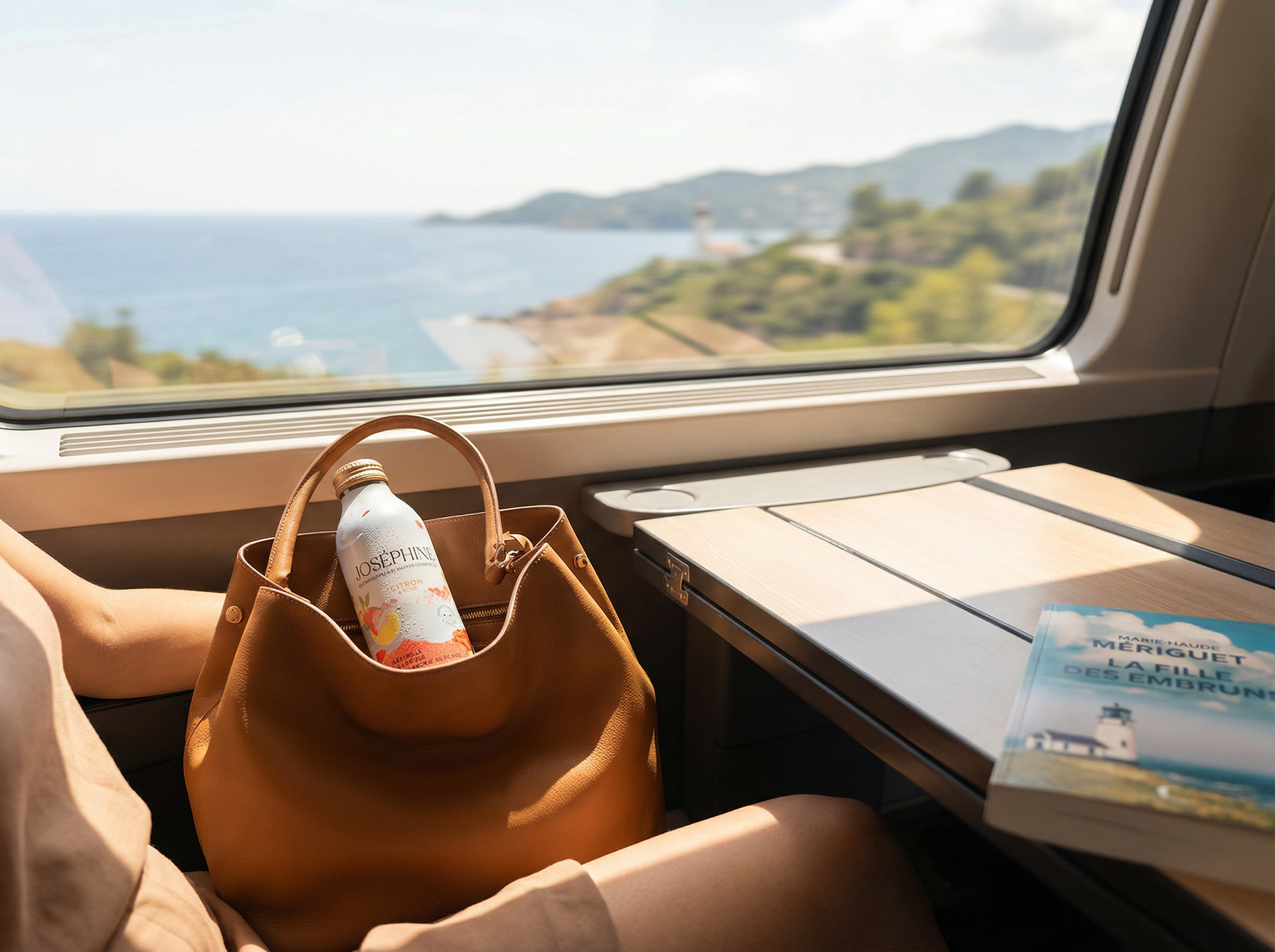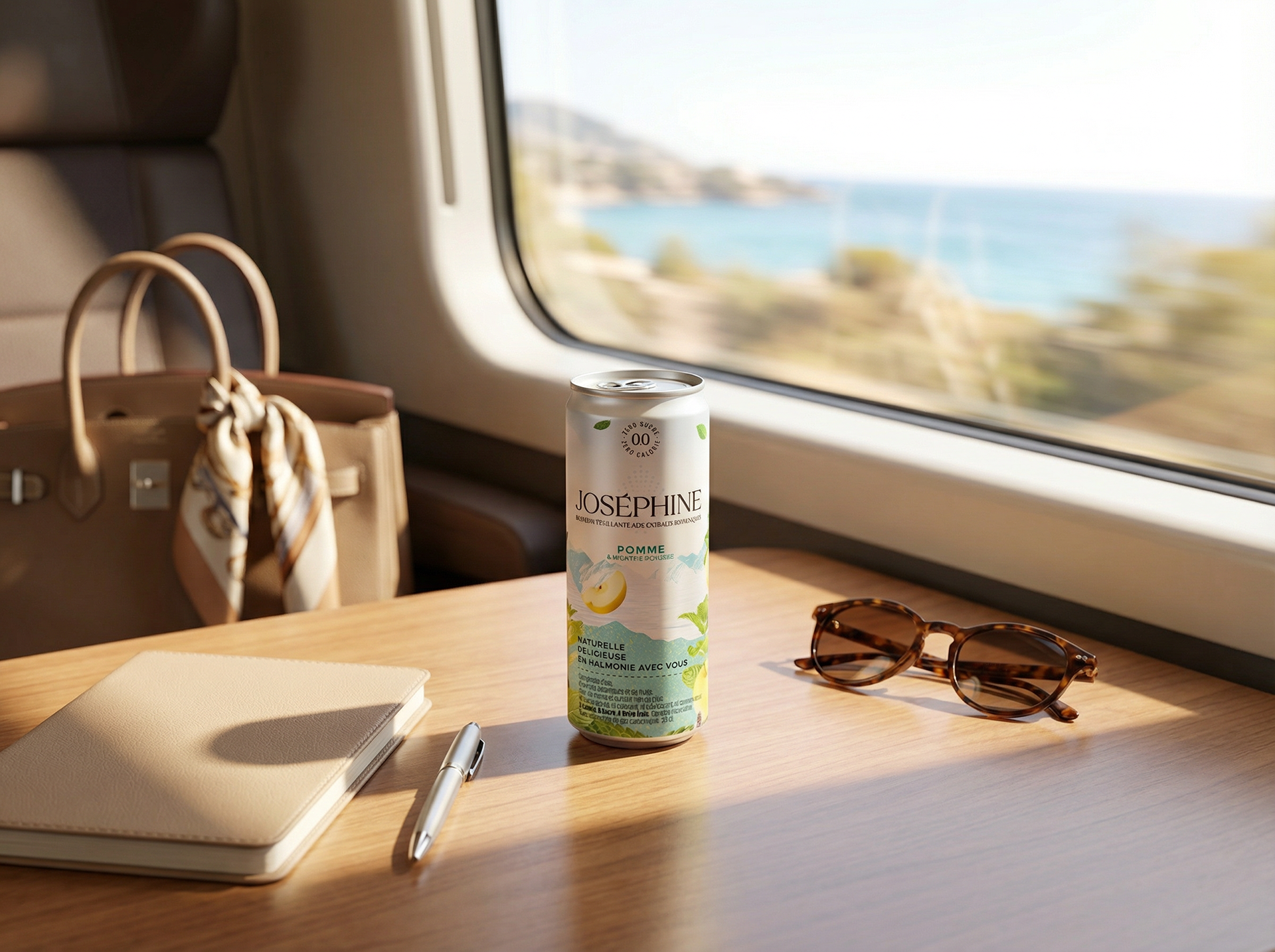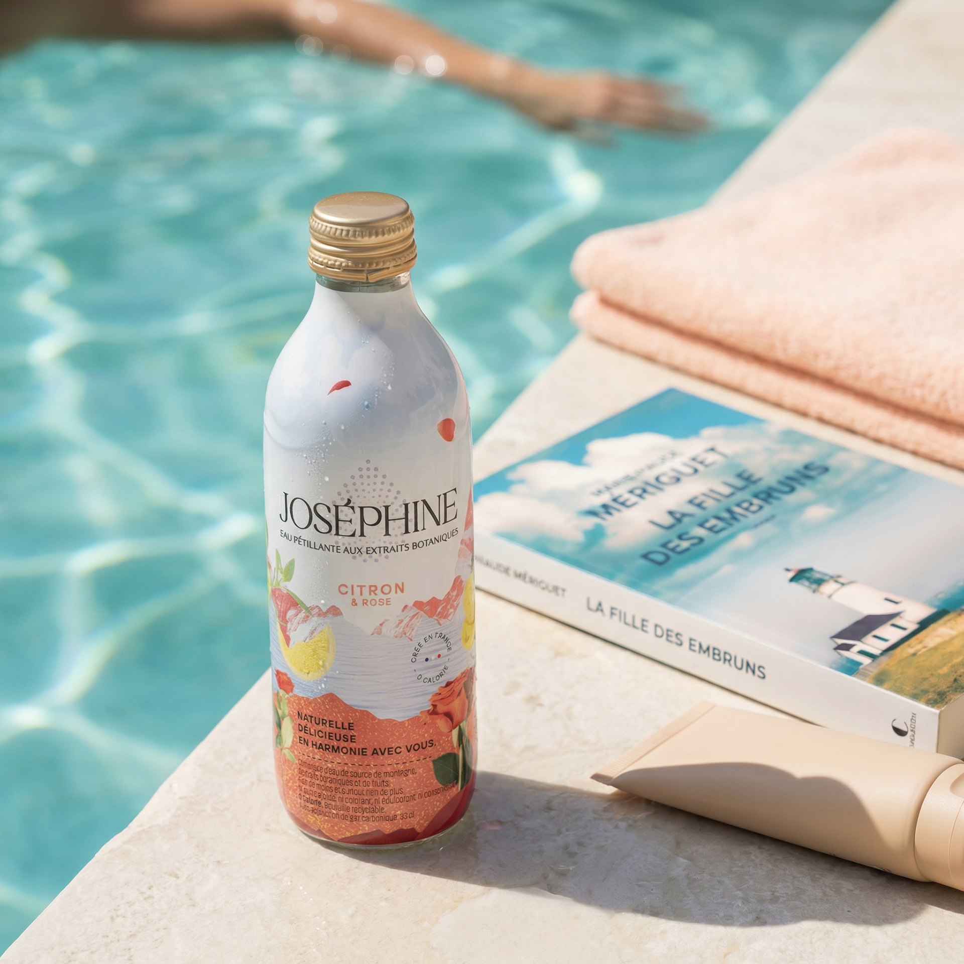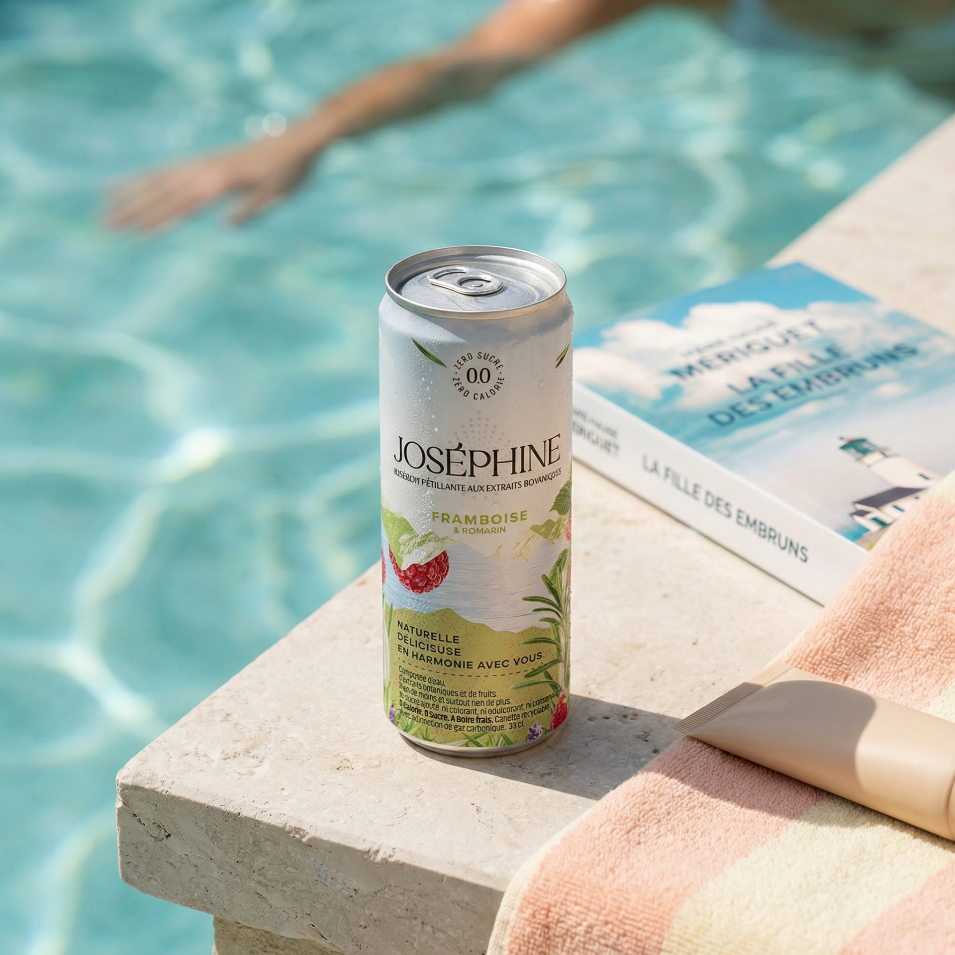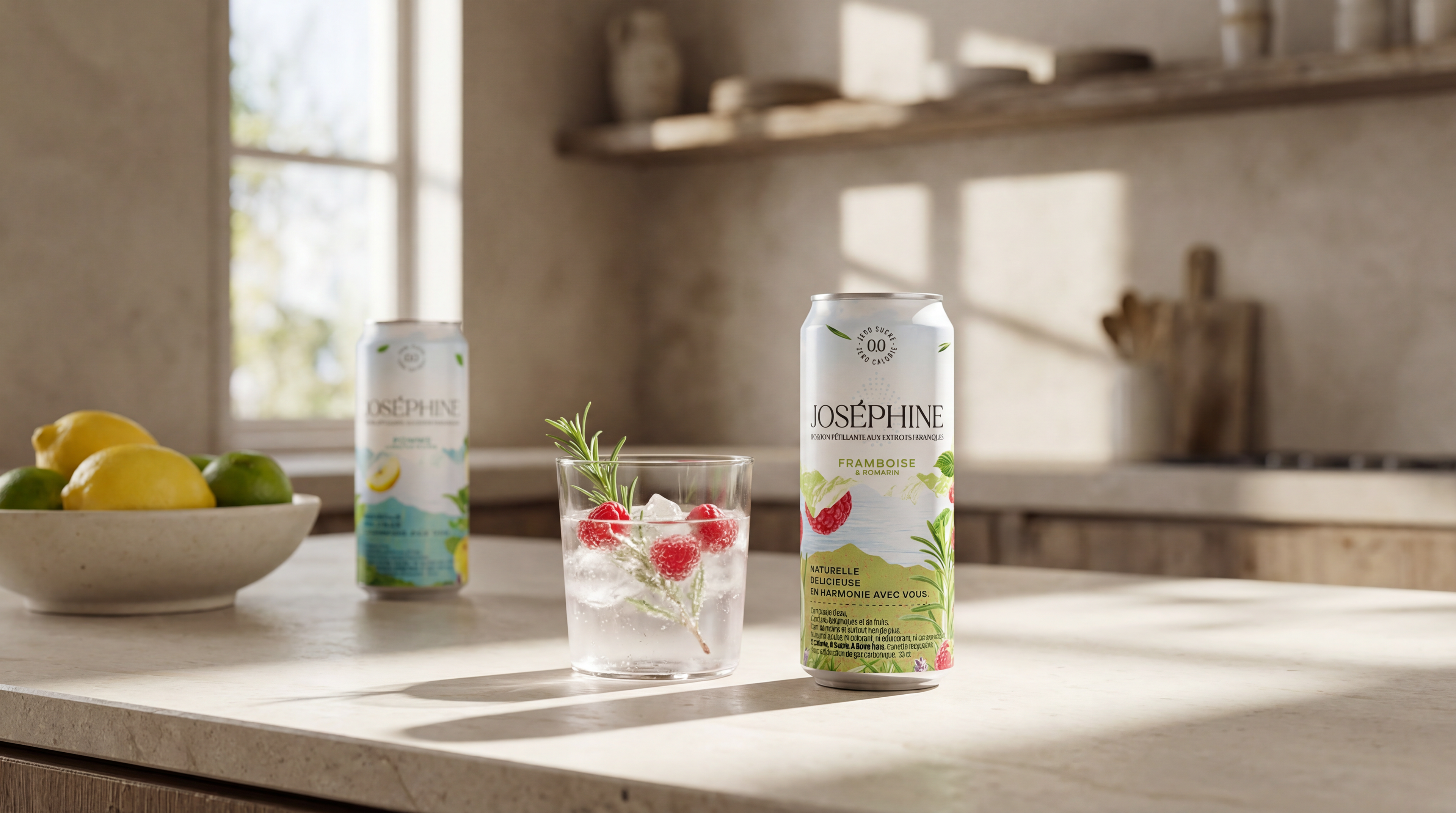 Imaginer une gamme de scènes lifestyle pour la gamme d'eau pétillante Joséphine, aux extraits botaniques - sans mobiliser une équipe de tournage, sans location, sans shooting. Le thème : l'été, le départ en vacances, la fraîcheur partagée entre amis. Des contextes variés, une cohérence de marque, un niveau de finition commercial.